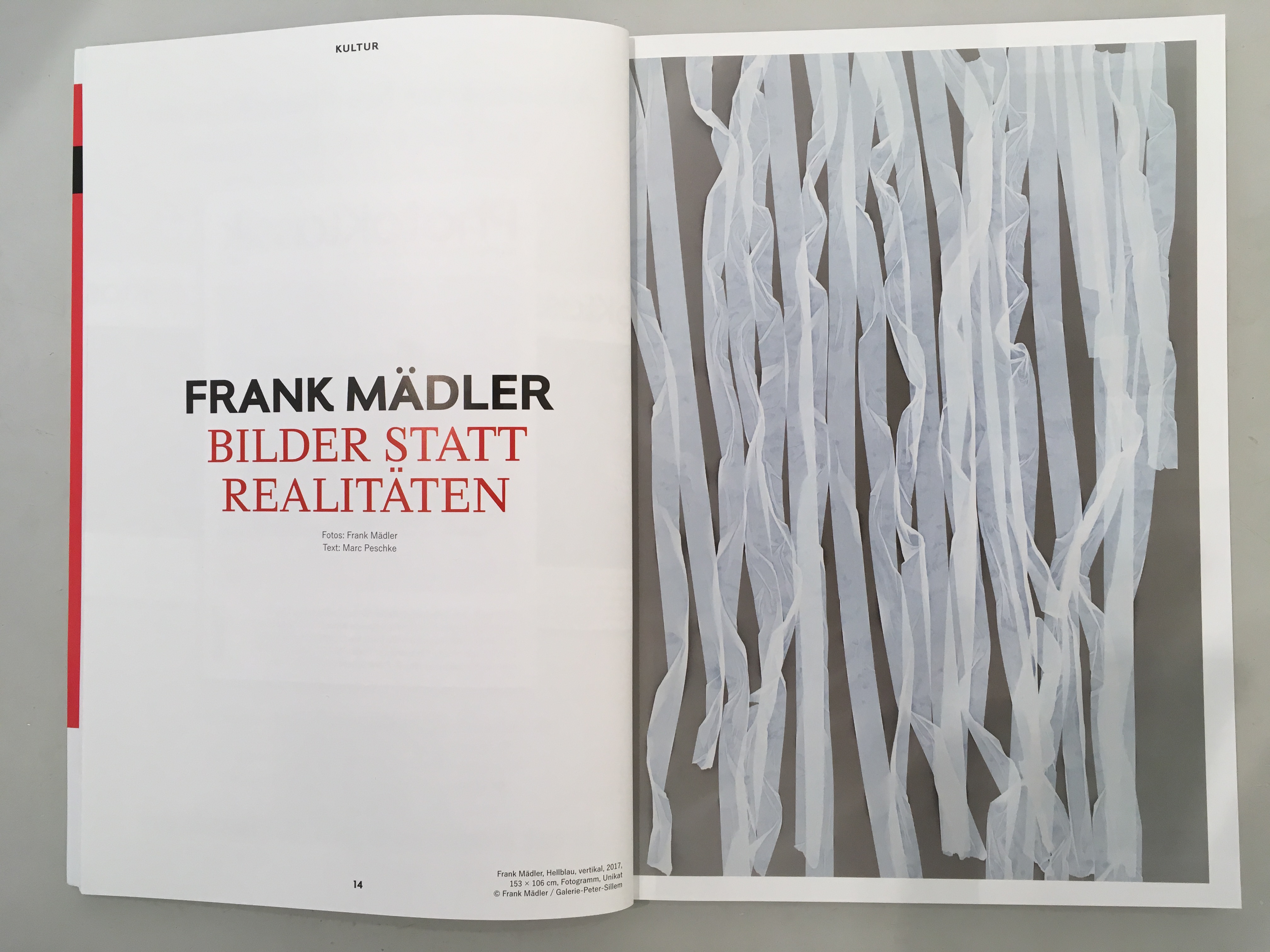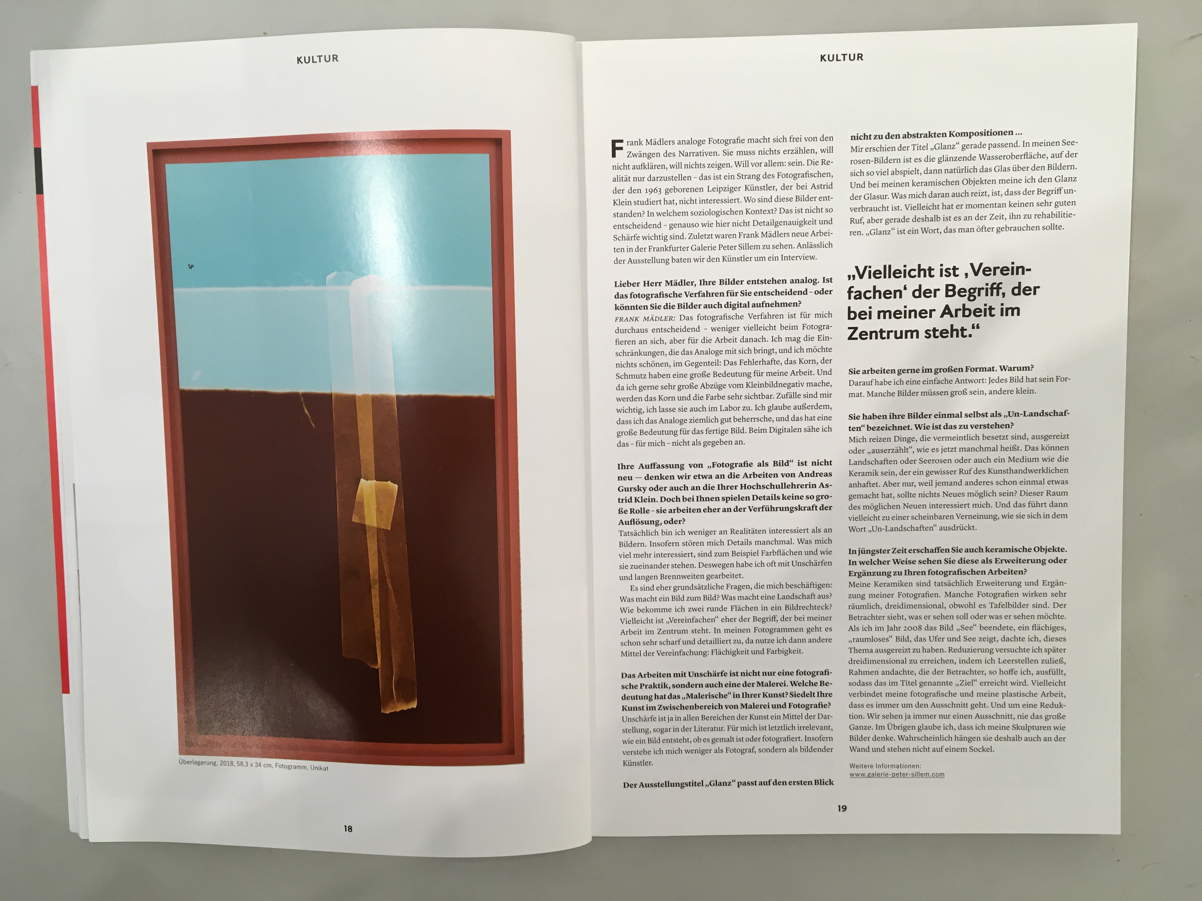 „Tasächlich bin ich weniger an Realitäten interessiert als an Bildern. [...] Es sind eher grundsätzliche Fragen, die mich beschäftigen: Was macht ein Bild zum Bild? Was macht eine Landschaft aus? Wie bekomme ich zwei runde Flächen in ein Bildrechteck? Vielleicht ist ‘Vereinfachen‘ eher der Begriff, der bei meiner Arbeit im Zentrum steht.“ Frank Mädler im Gespräch mit Marc Peschke, PhotoKlassik Nr. I/2019