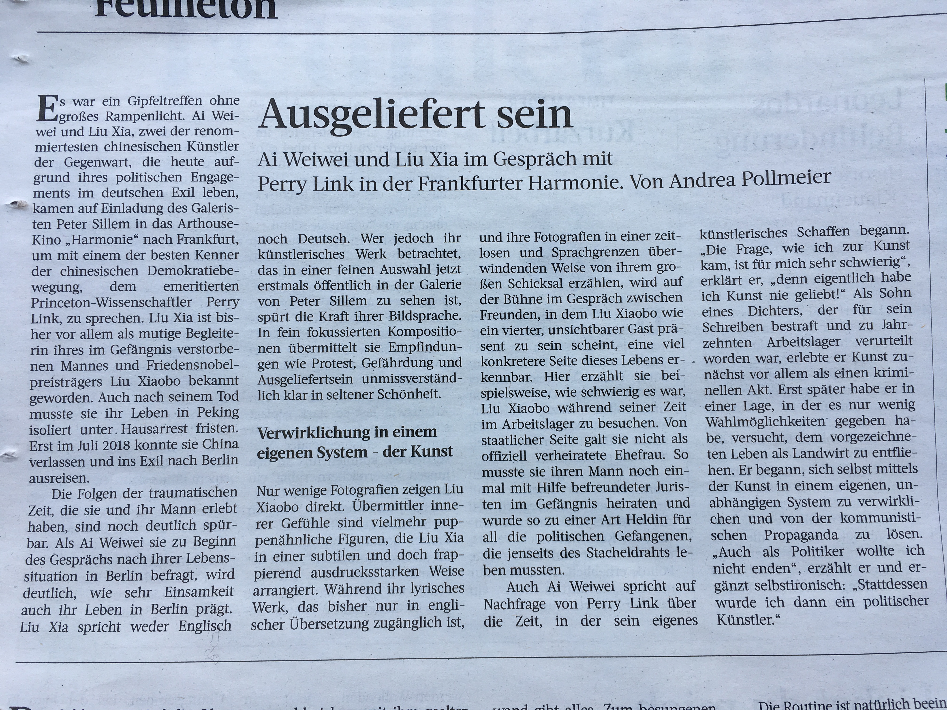 "Ein Gipfeltreffen ohne großes Rampenlicht": Andrea Pollmeier bespricht "Artists in Conversation" mit Liu Xia und Ai Weiwei
